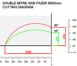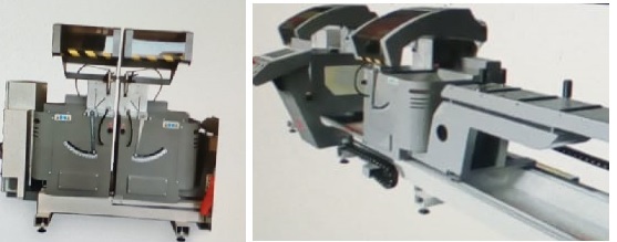 Double head cutting off machine with rising blades for mitre cuts. With fixed unit on the left side and motorized movable unit on the right side.
